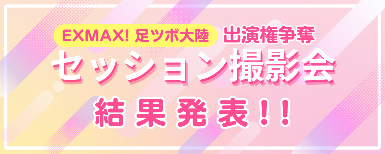 『EXMAX! 足ツボ大陸 出演権争奪 セッション撮影会』結果発表 『EXMAX! 足ツボ大陸 出演権争奪 セッション撮影会』 結果発表 応援してくださった皆さま、ありがとうございました。応援ポイントの集計結果をもとに、上位2名の出演が決定しました。 ... 2026年2月26日