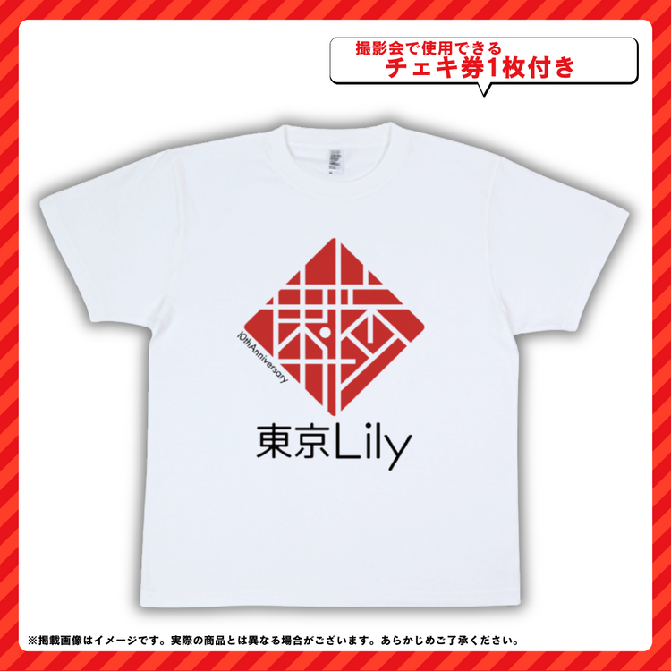 10周年記念の限定デザインTシャツ。撮影会で使用できるチェキ券付きで、S〜XLの4サイズ展開です。シンプルながら特別感のある一枚で、イベントや日常使いにもおすすめ。